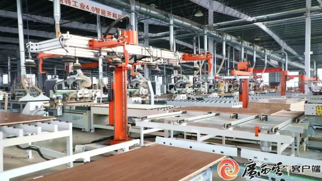 “嗡——”12月的贵港(覃塘)国际绿色家居产业园内,广西柏秀家居有限公司的8条全新智能生产线正全速运转:机械臂以0.3毫米的高精度精准抓取板材,激光封边机飞速作业。车间外,满载销往广东板材的货车刚驶离,另一辆空车就已在装货区等候。