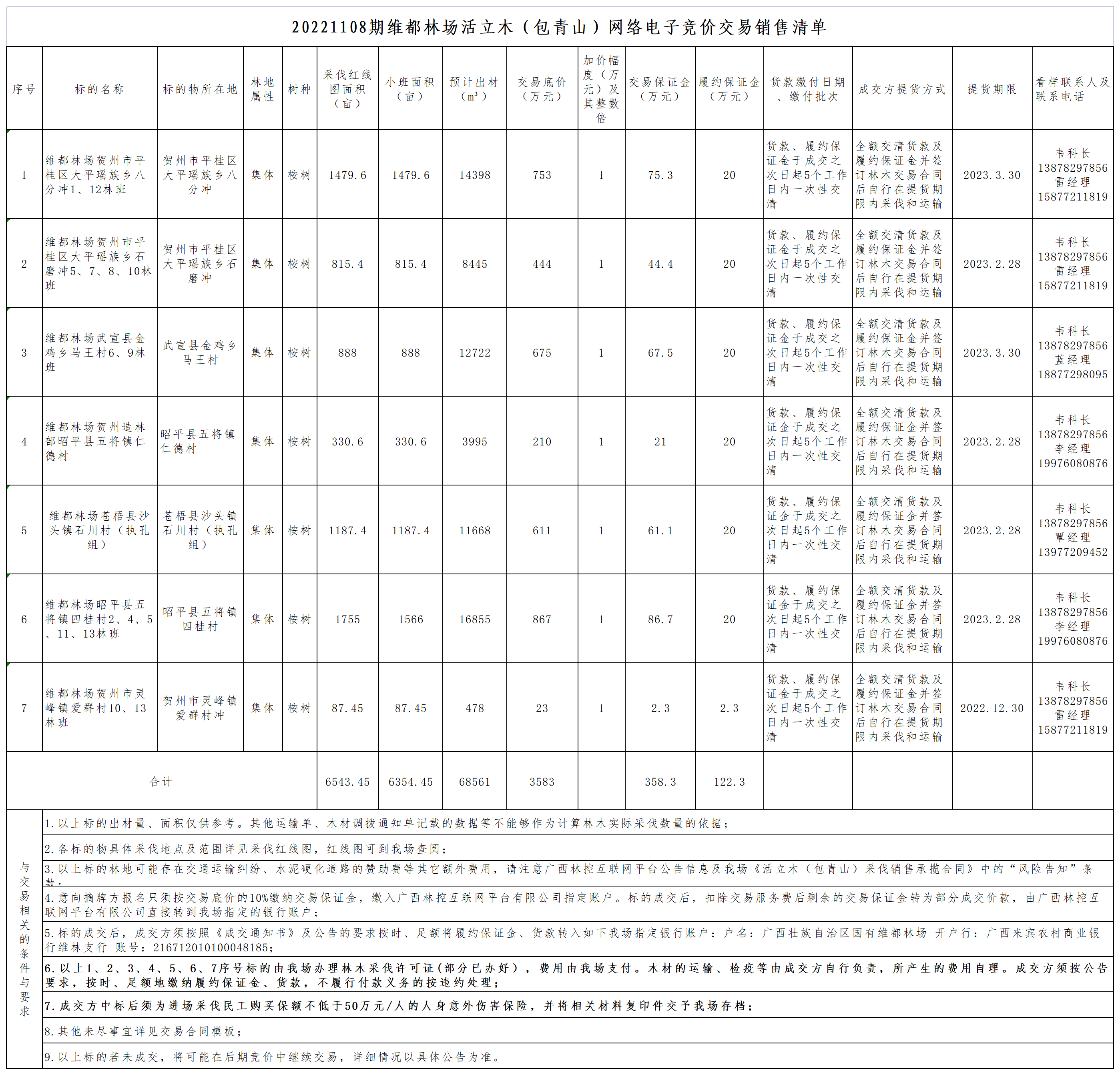 1.本公告关于标的面积、出材量等所有内容的描述仅供参考,如有出入以标的现状为准,挂牌方及广西林控平台不承担标的面积与实测面积、标的出材量与实际出材量差异等责任,不调整相应的成交价格。 2.未尽事宜详见交易清单、交易合同模板等本公告其他附件材料。 | ||